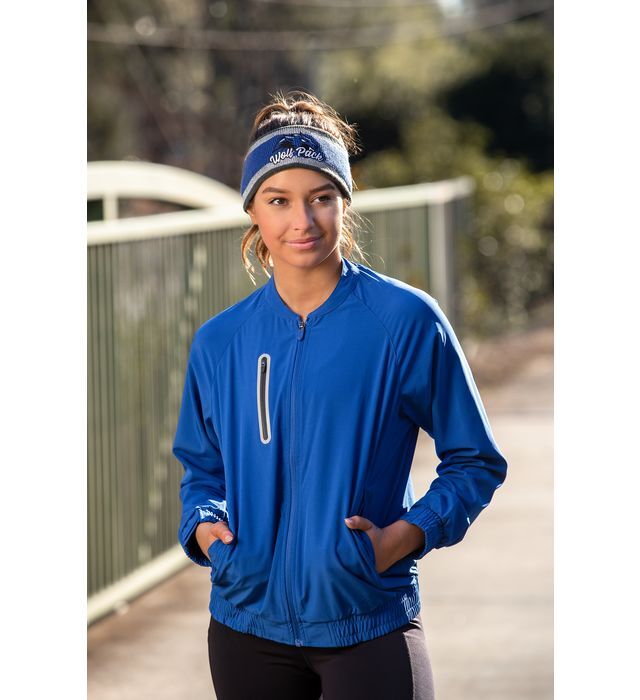 * 90% polyester/10% spandex, 4-way stretch woven fabric * Ladies' fit * Woven label * Front zipper * Low profile collar * Raglan sleeves with thumbholes for warmth * Locking front and dual inside pockets * Zippered valuables chest pocket with reflective metallic silicone welded detailing * Elastic cuffs and bottom * Water-repellent